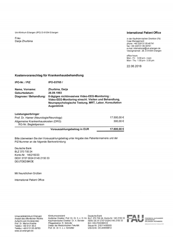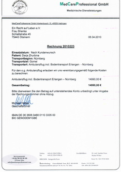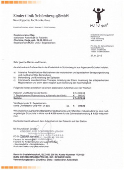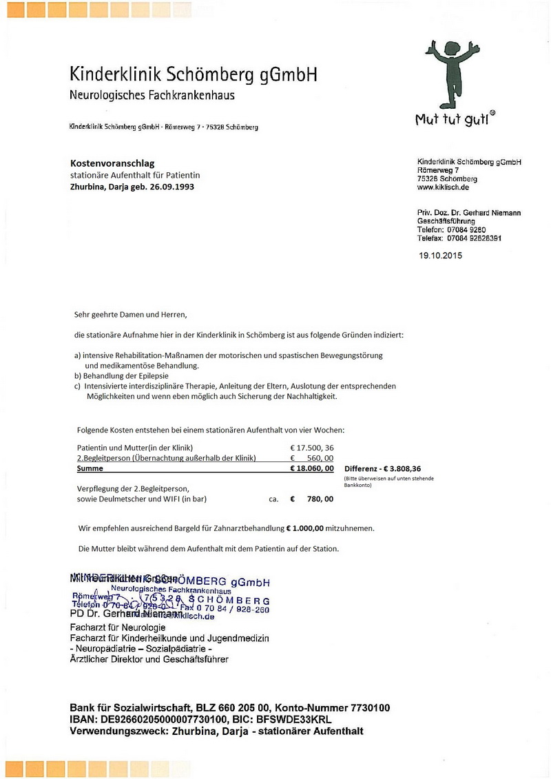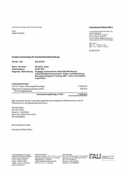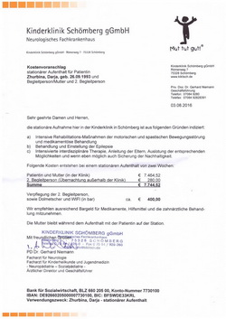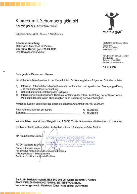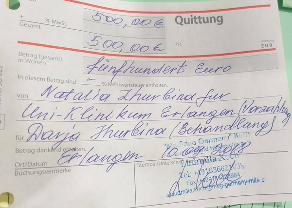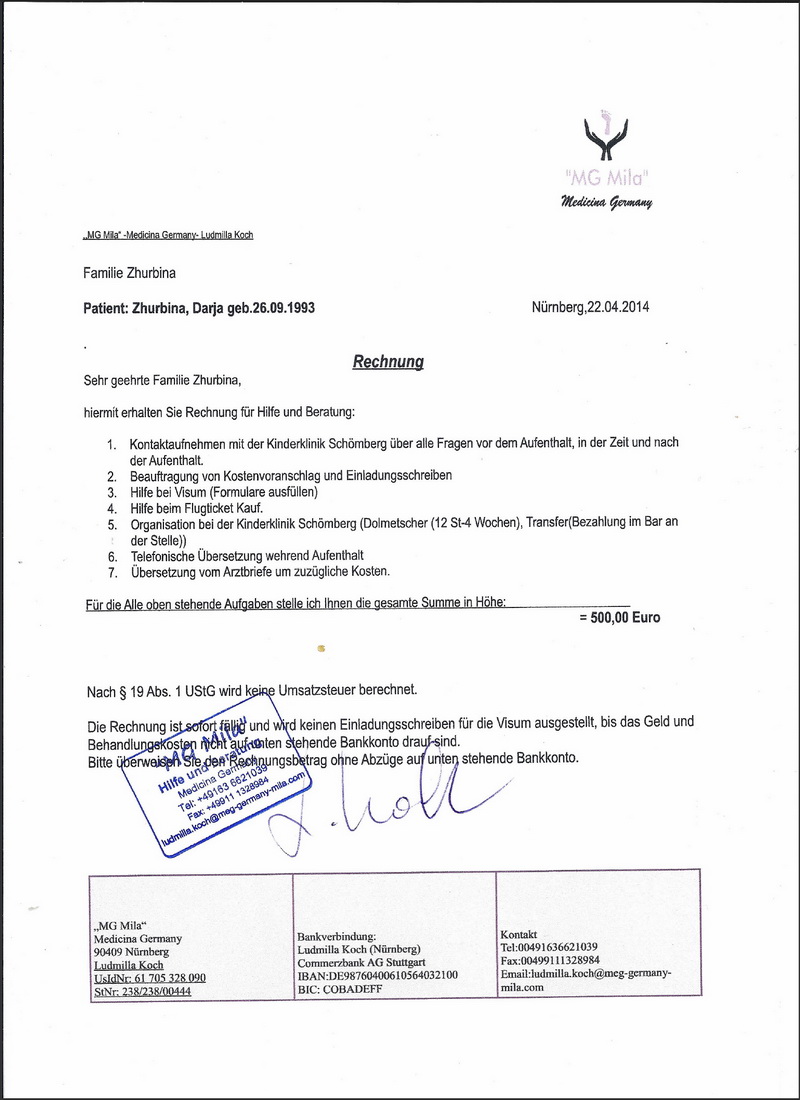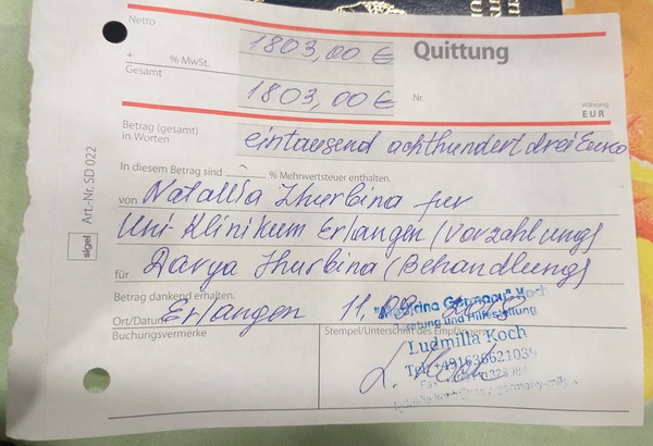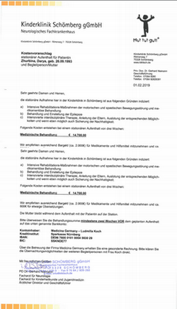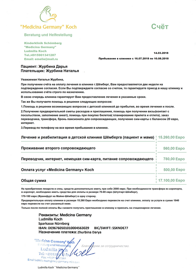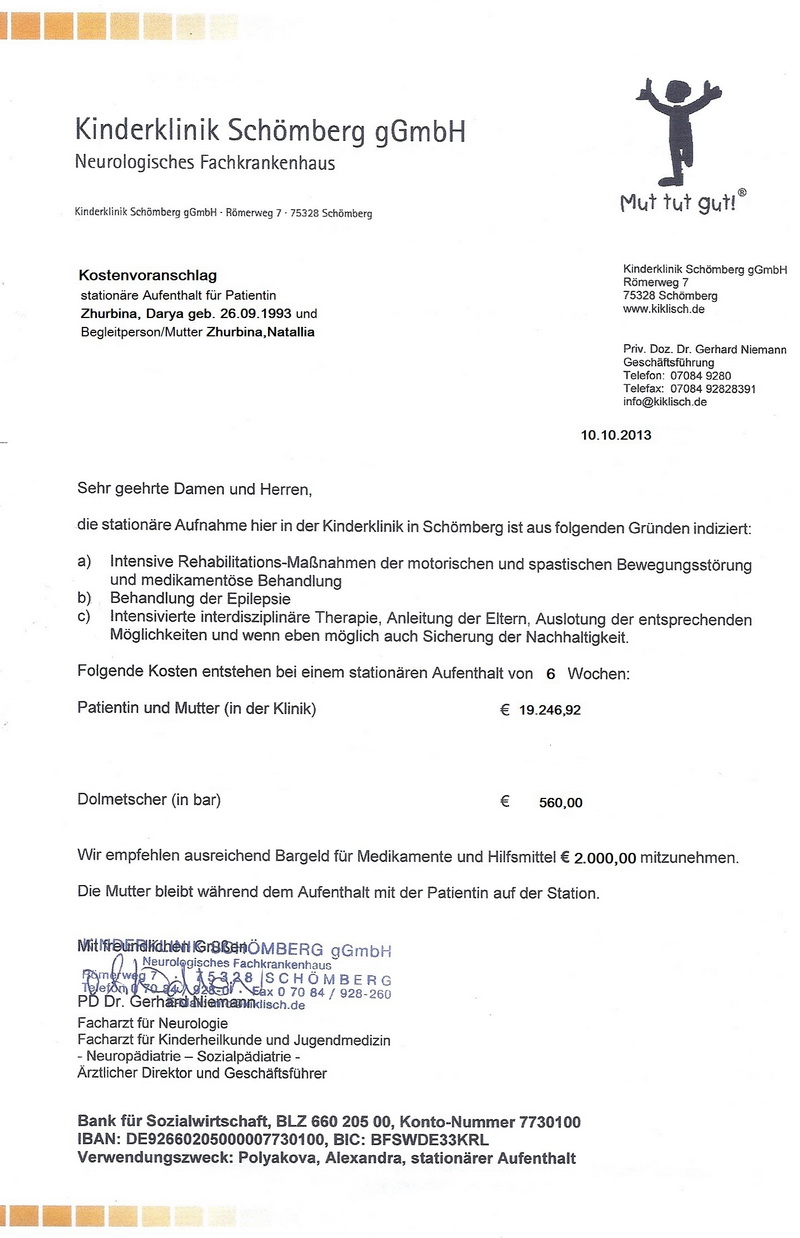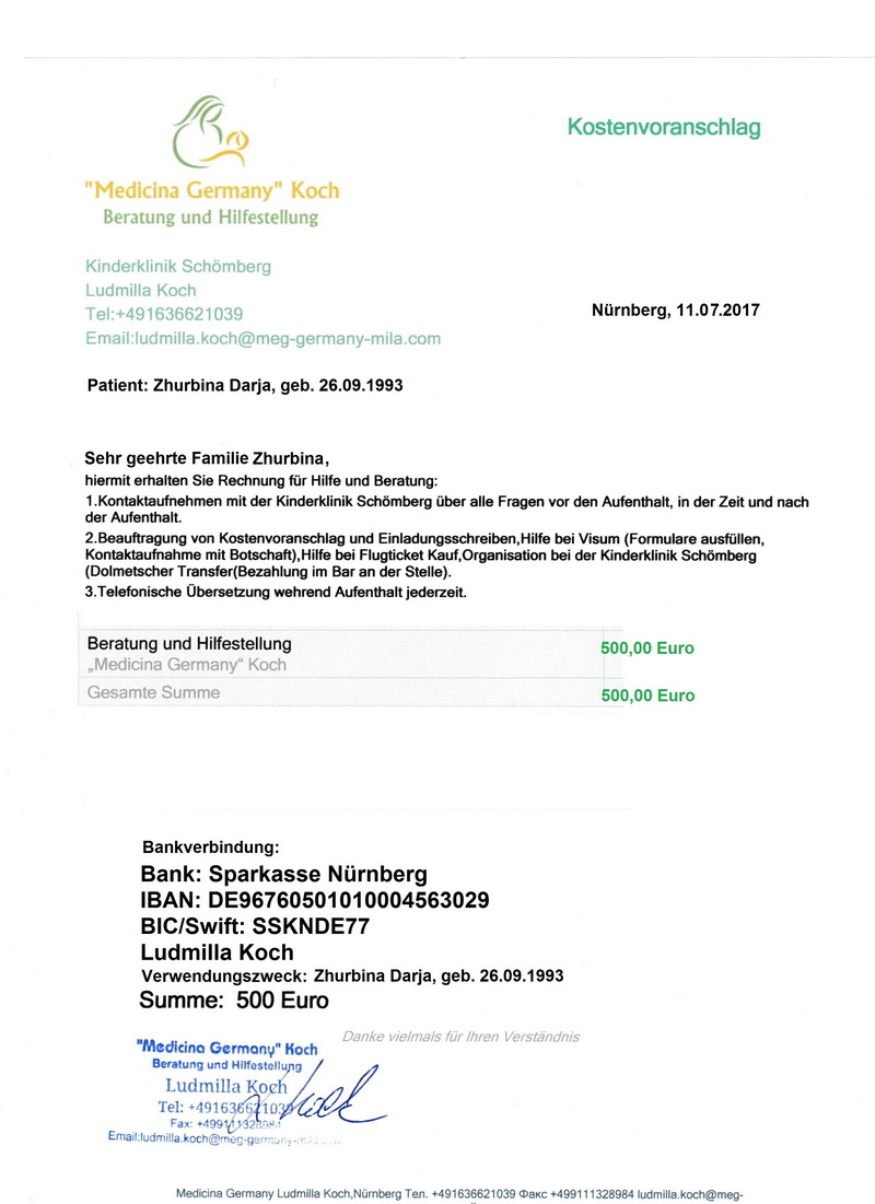 Подтверждение согласия благотворительного фонда Германии на сбор средств для лечения Даши и Счет из клиники
