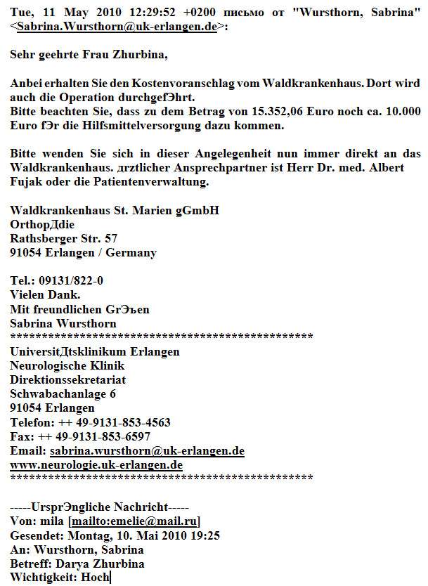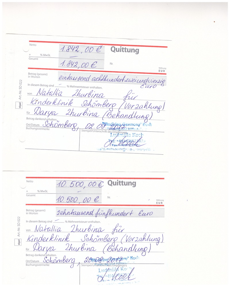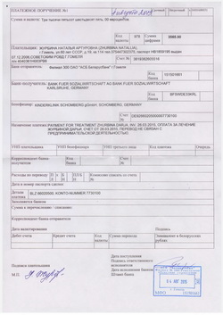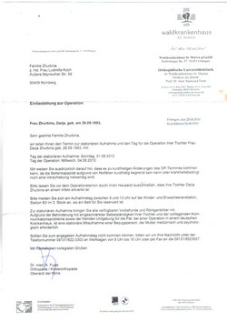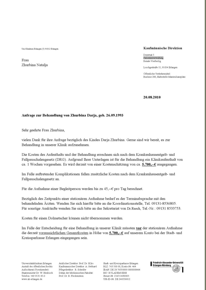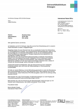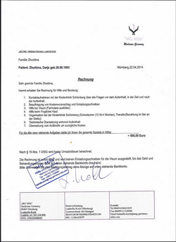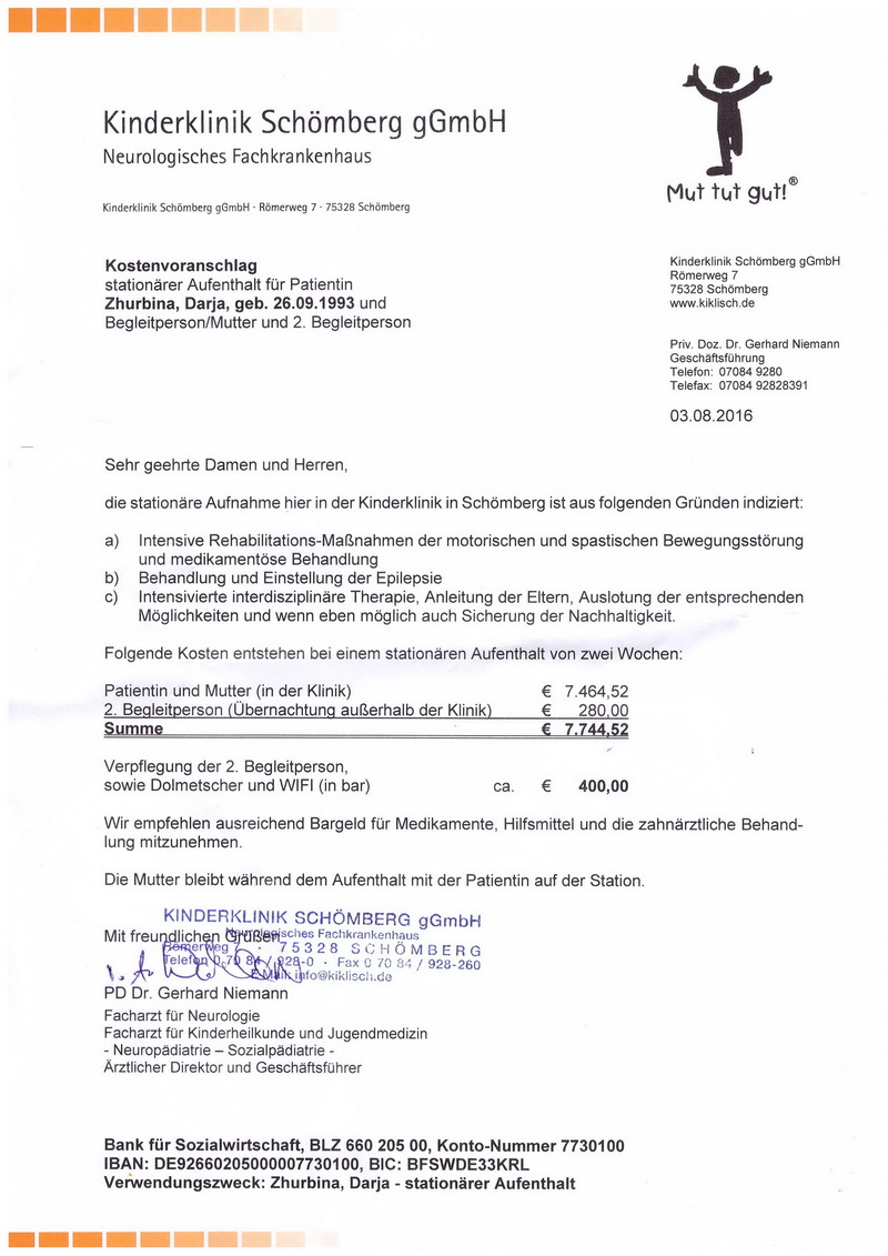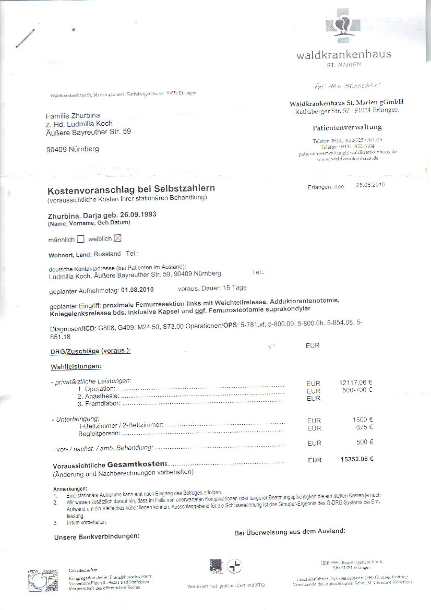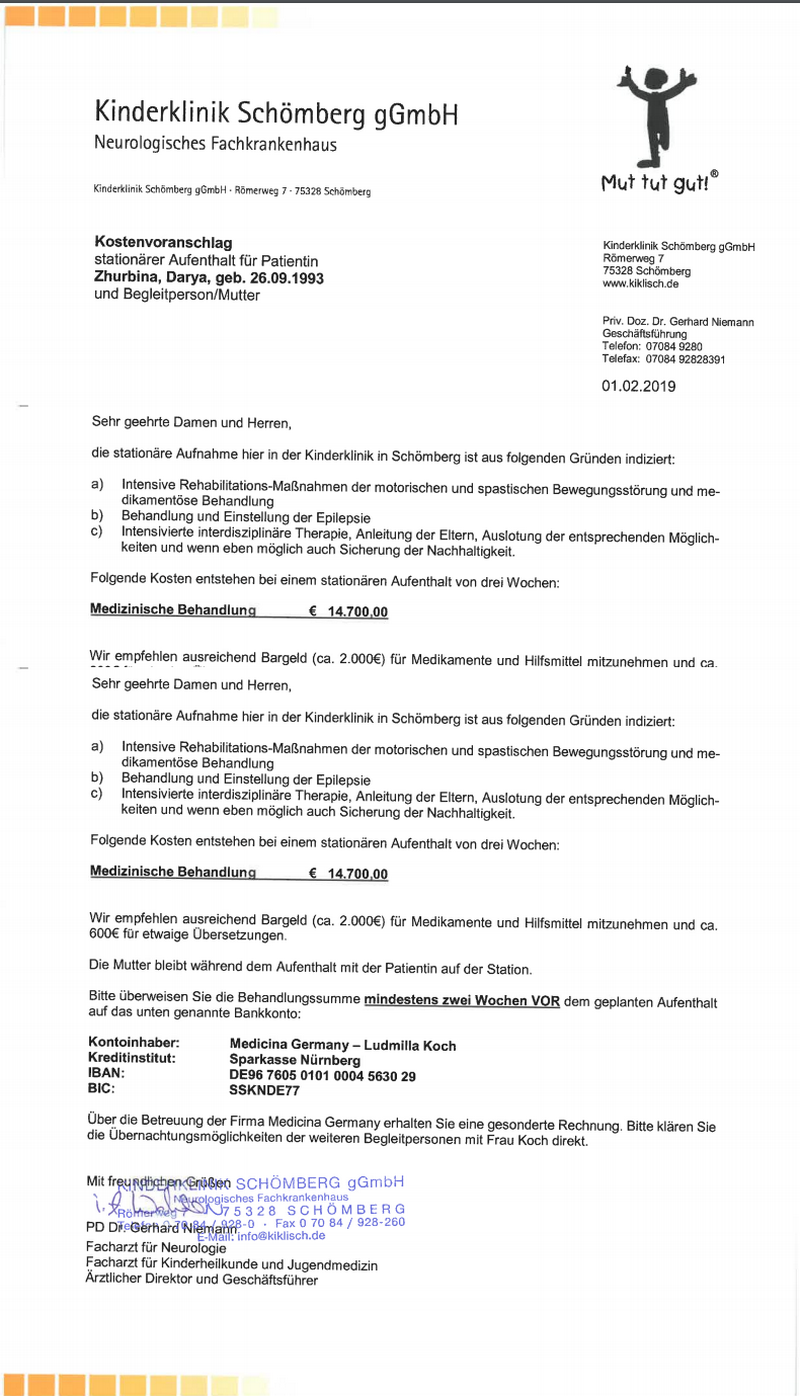 Подтверждение согласия благотворительного фонда Германии на сбор средств для лечения Даши и Счет из клиники