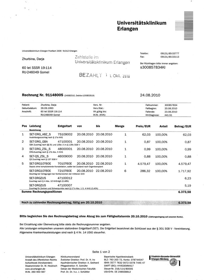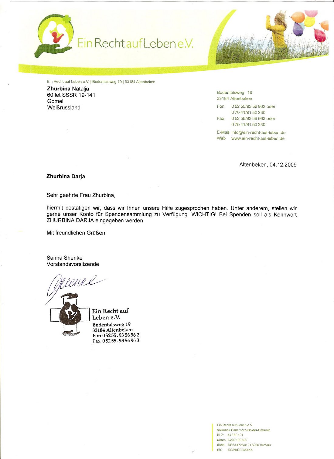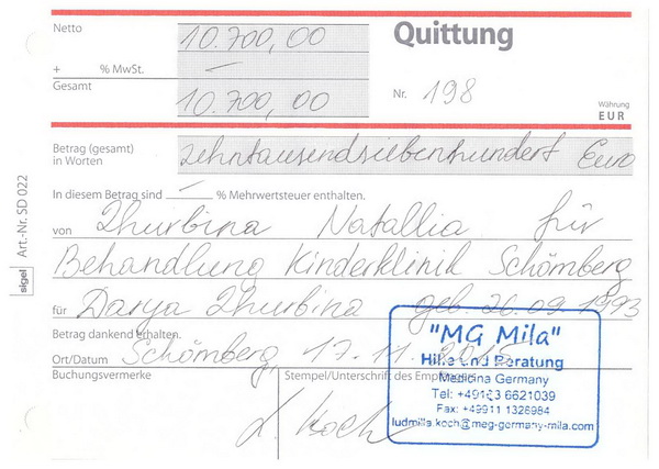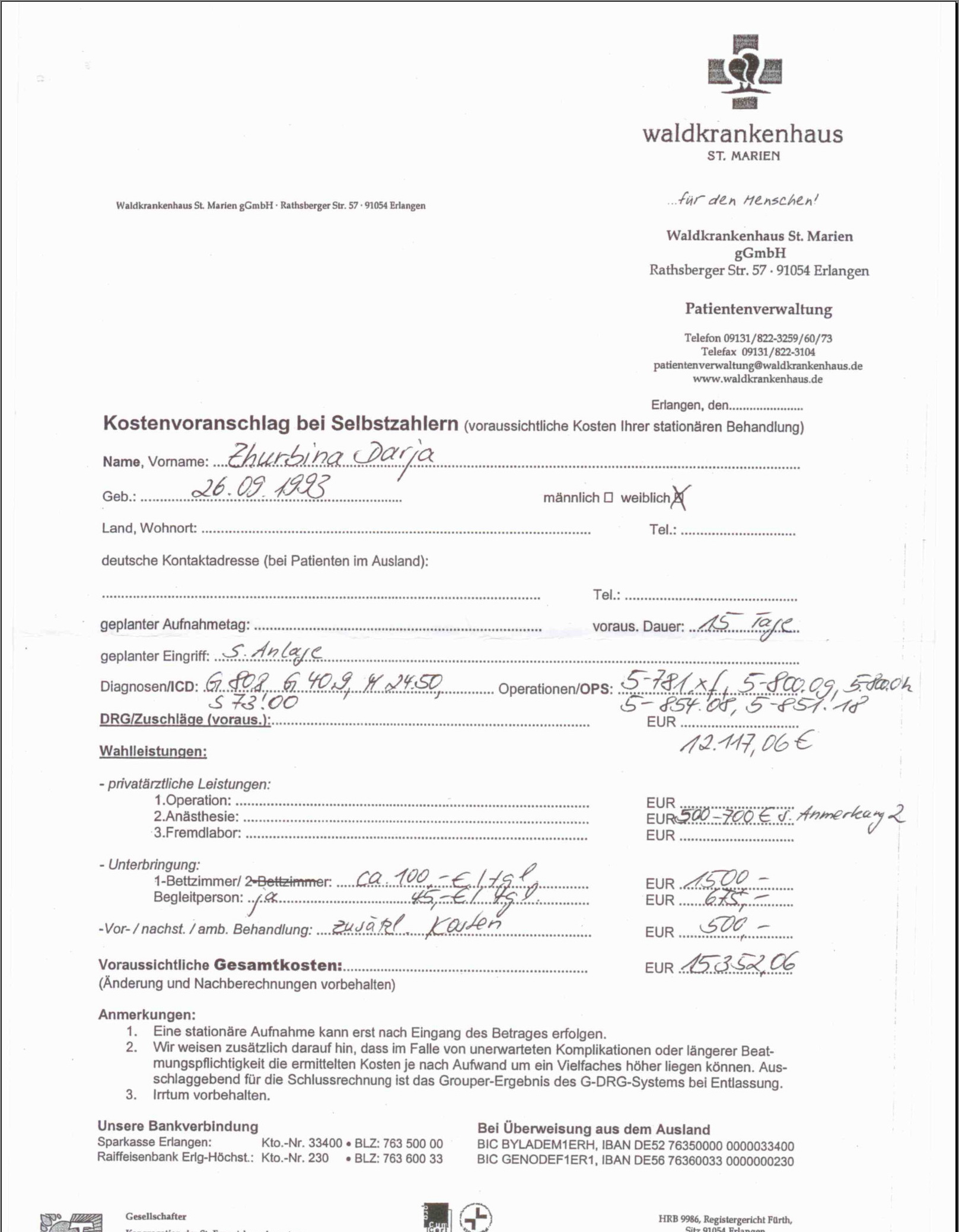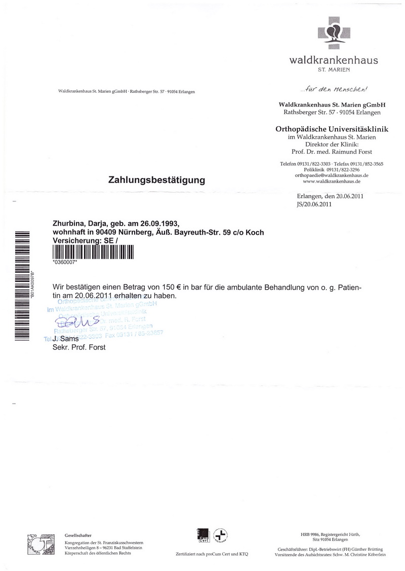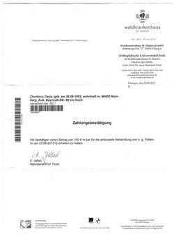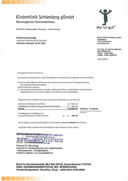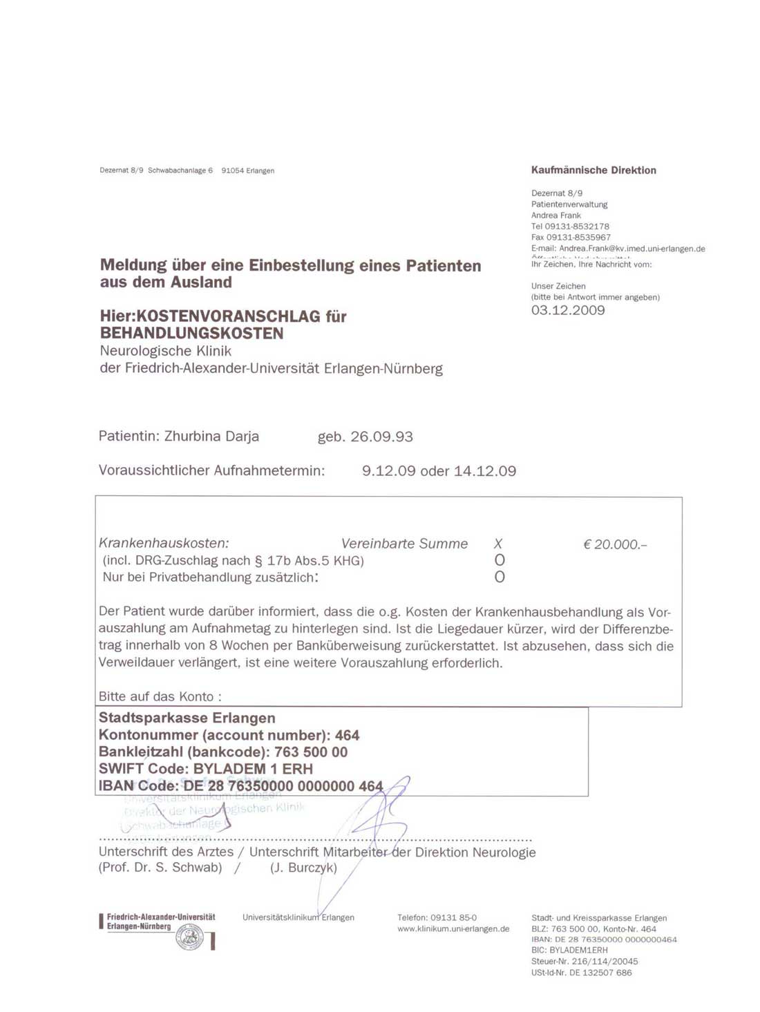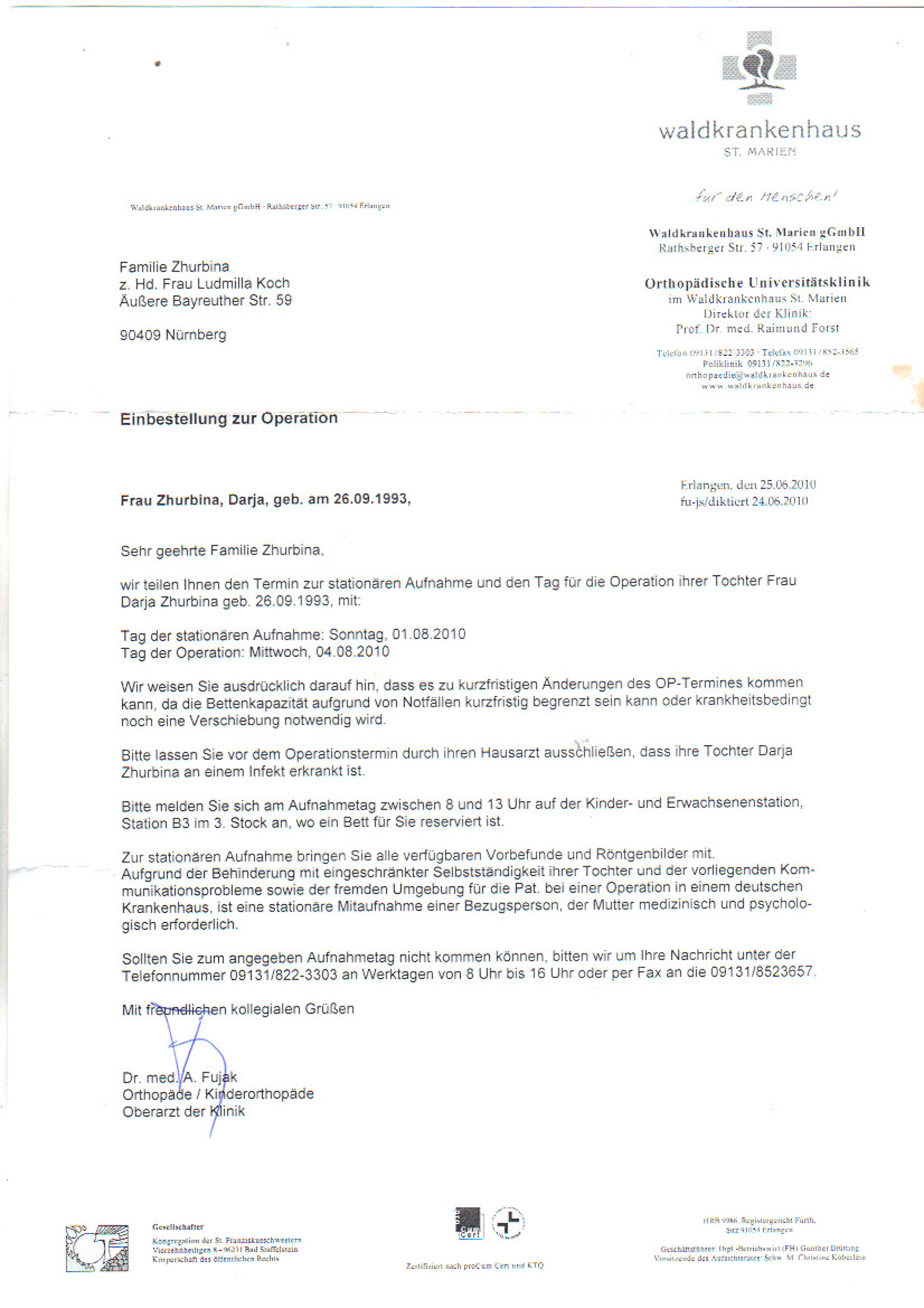 Подтверждение согласия благотворительного фонда Германии на сбор средств для лечения Даши и Счет из клиники