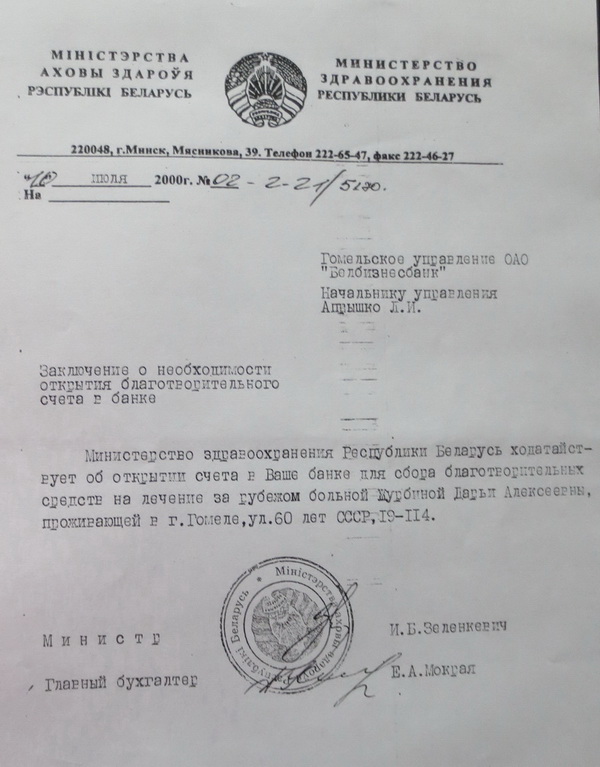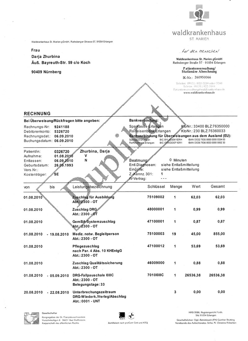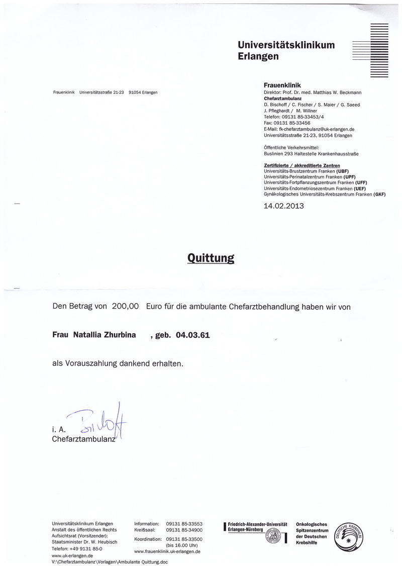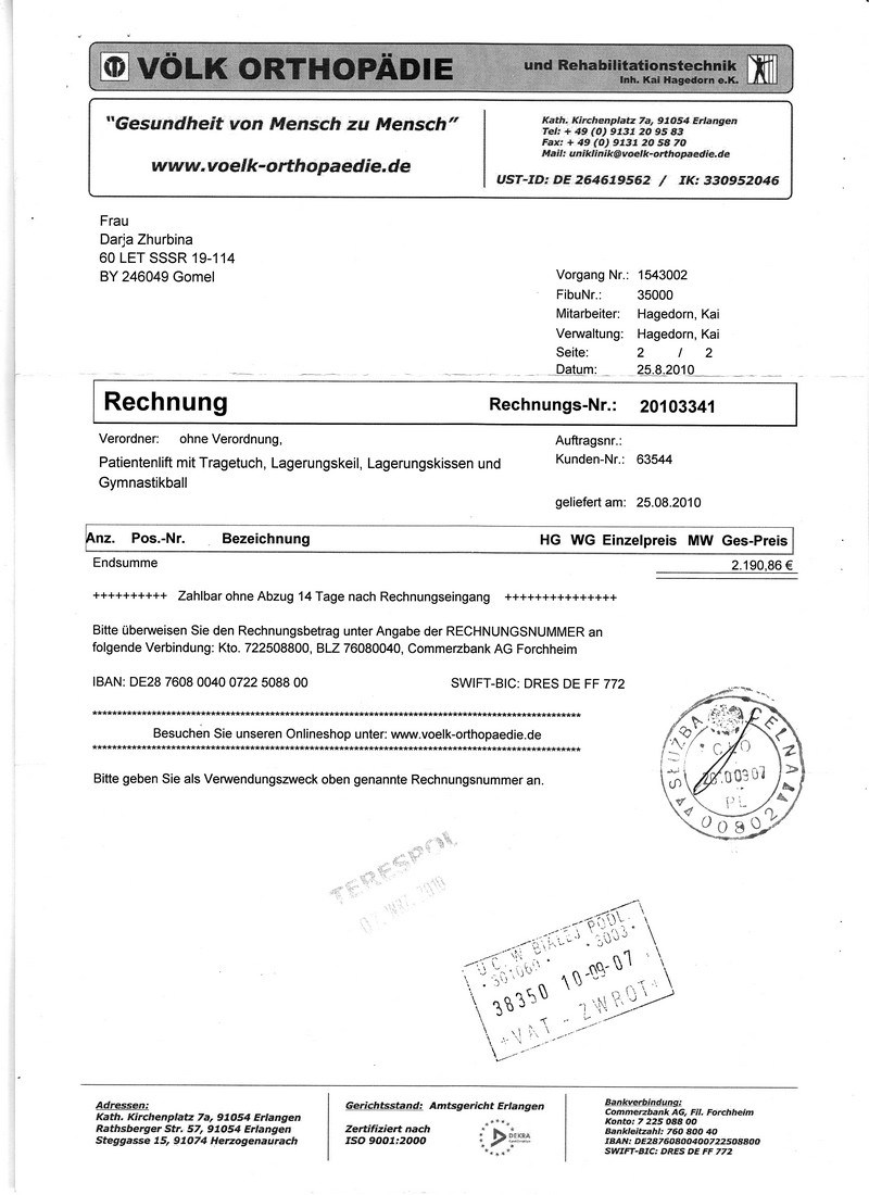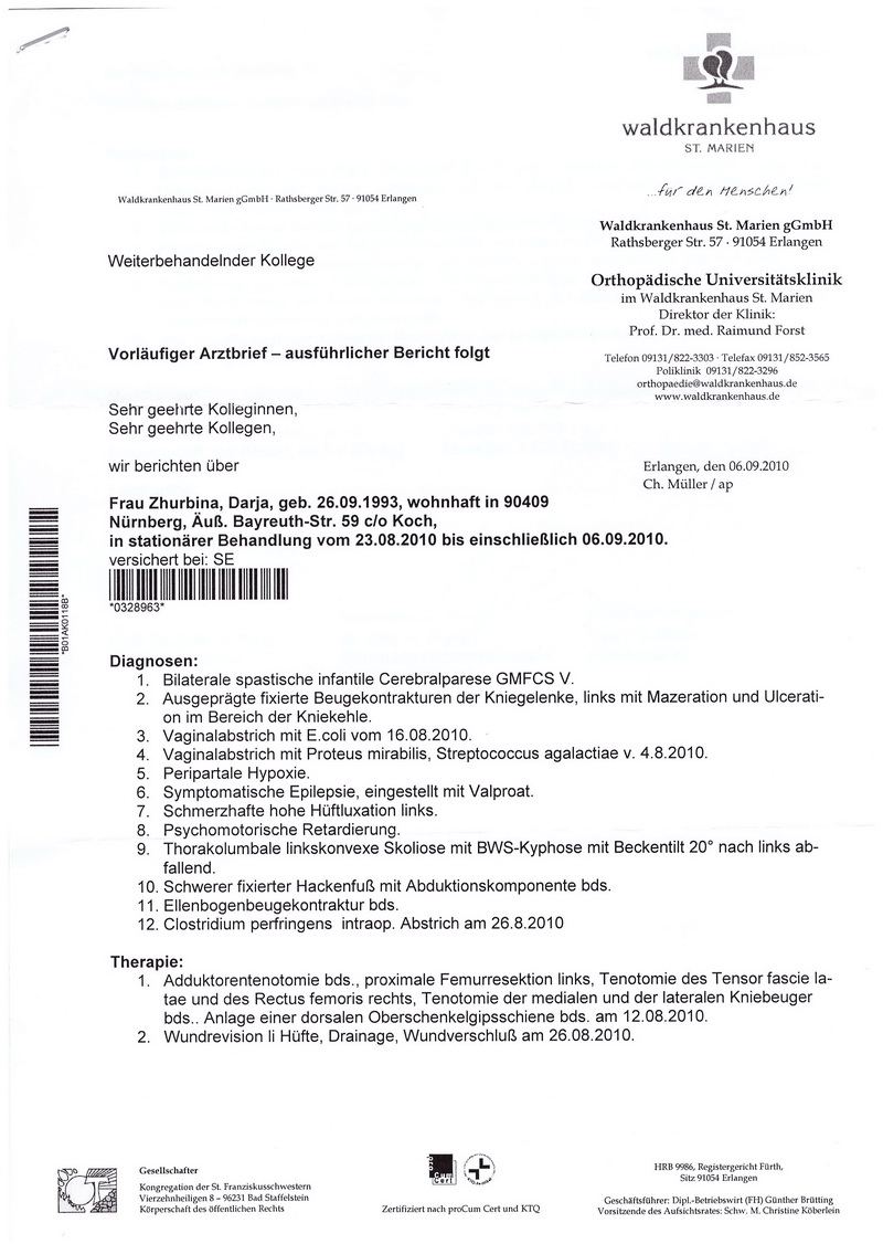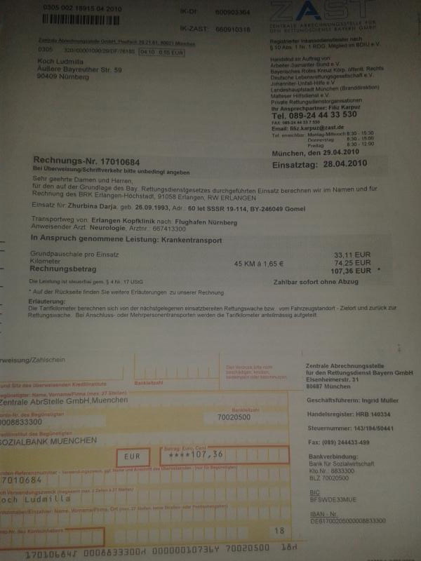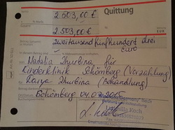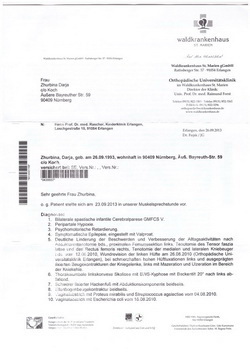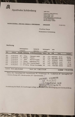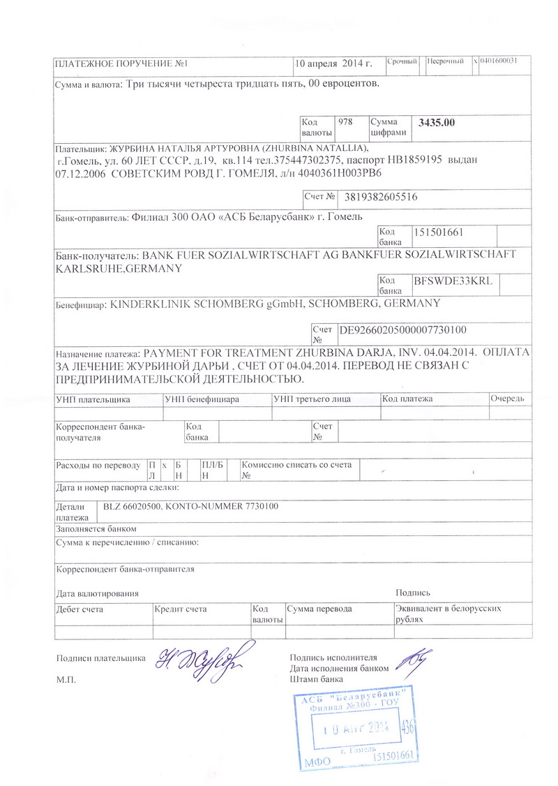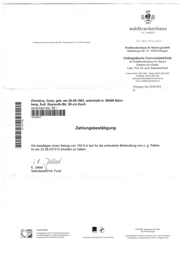 Подтверждение согласия благотворительного фонда Германии на сбор средств для лечения Даши и Счет из клиники
